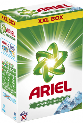 Ariel Mountain Spring 10kg. Powerful stain removal with fresh mountain fragrance. Works at low temperatures.