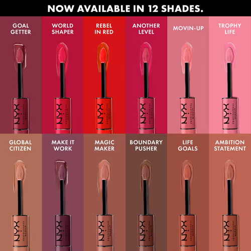 NYX Shine Loud Lip Colour and Gloss. Two-step formula for intense colour with glossy finish. 16 shades.