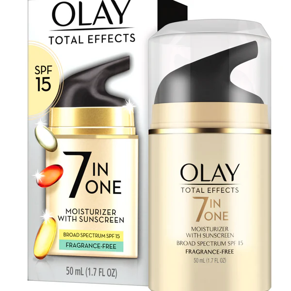 Olay Total Effects 7-in-1 Day Moisturiser. Fights fine lines, dark spots, rough texture. SPF15 UV protection.